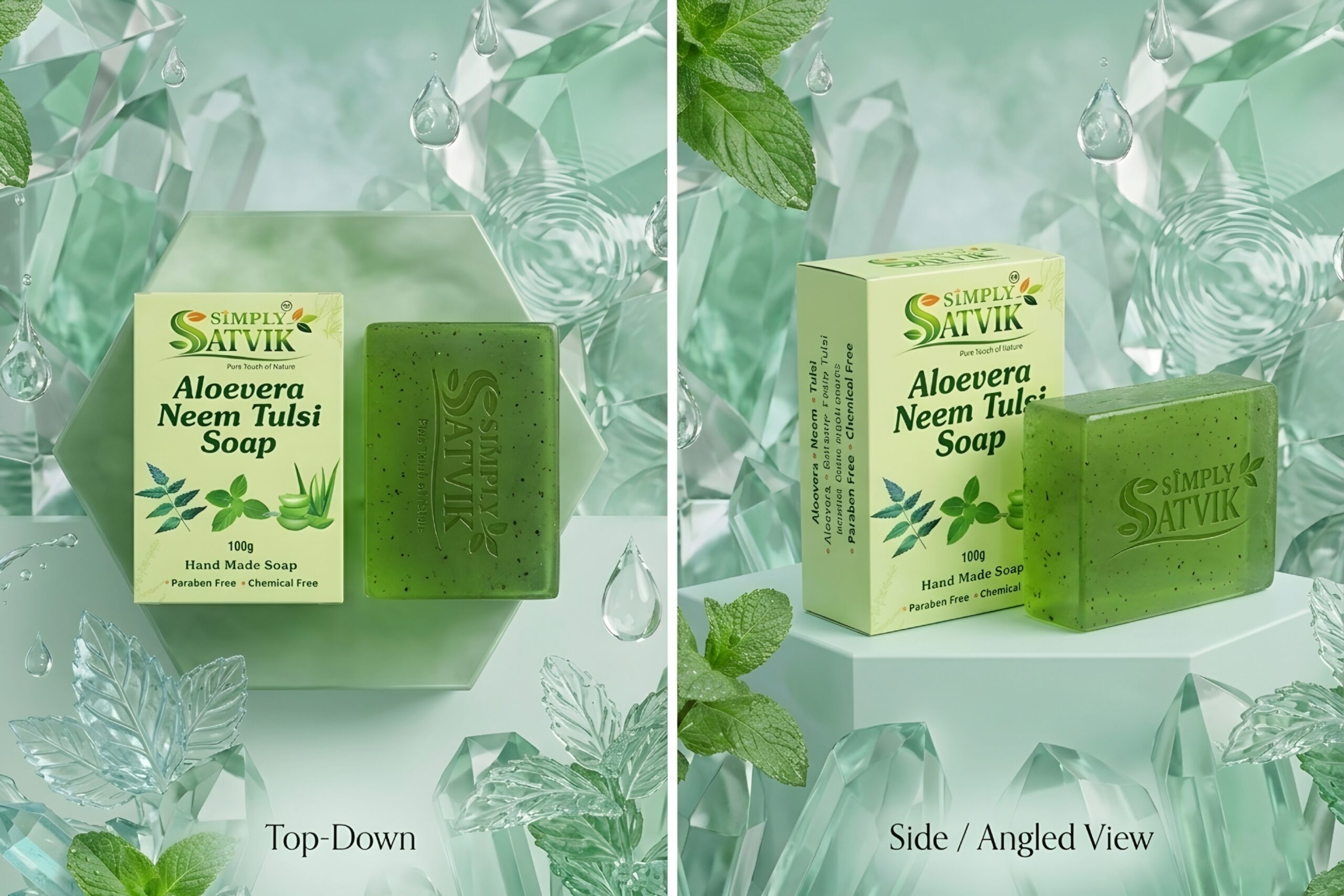 Give your skin the protection of nature with Simply Satvik Aloe Vera Neem Tulsi Soap a powerful Ayurvedic blend designed to cleanse, heal, and protect your skin naturally.