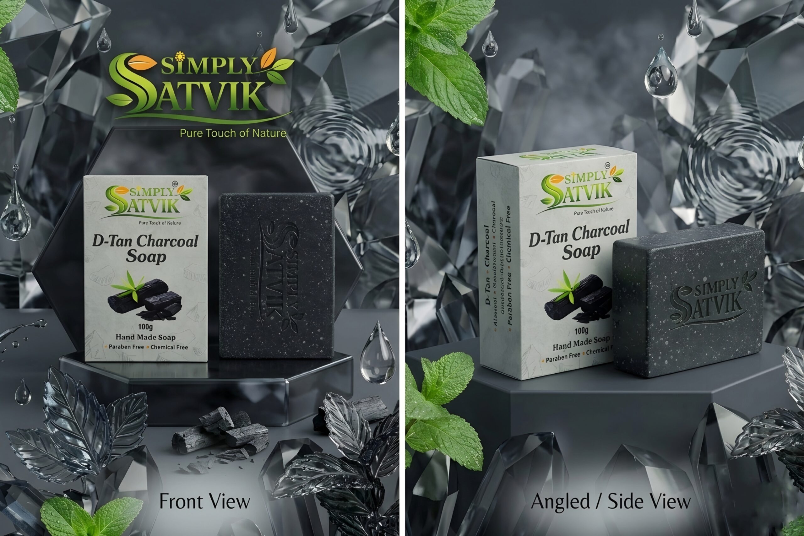 Reveal clear, refreshed, and glowing skin with Simply Satvik D-Tan Charcoal Soap — a powerful blend of activated charcoal and natural ingredients designed for deep cleansing and skin detox.